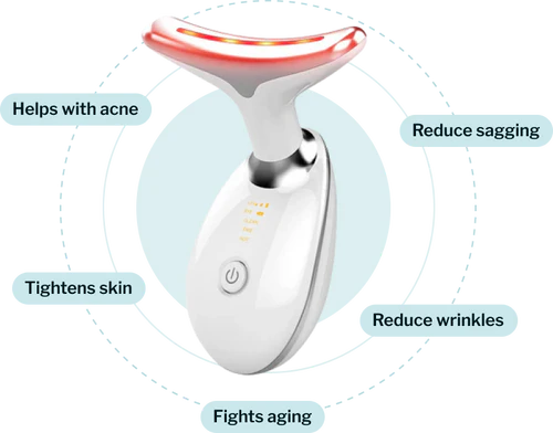The gentle microcurrents emitted by the device help to stimulate the facial muscles, leading to improved muscle tone and firmness. This helps plump and smooth the appearance of fine lines and wrinkles by restoring elasticity and definition to the skin. The massaging motion of the device helps to increase blood circulation and lymphatic drainage in the treatment area. This boost in circulation supports collagen production and skin rejuvenation. The massage also helps to physically break up and minimize the appearance of wrinkles and fine lines. The LED Light therapy also supercharges lifting progress by promoting collagen production which aids in skin elasticity and firmness.